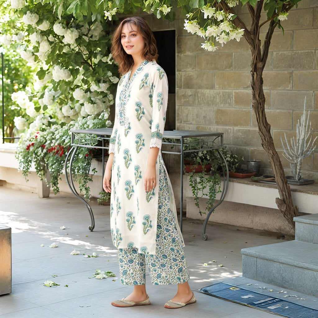 Anni Designer Women'S Rayon Viscose Straight Printed Kurta With Palazzo (Kumbh White_L_White_Large),White,L,Rayon Blend,Classic,