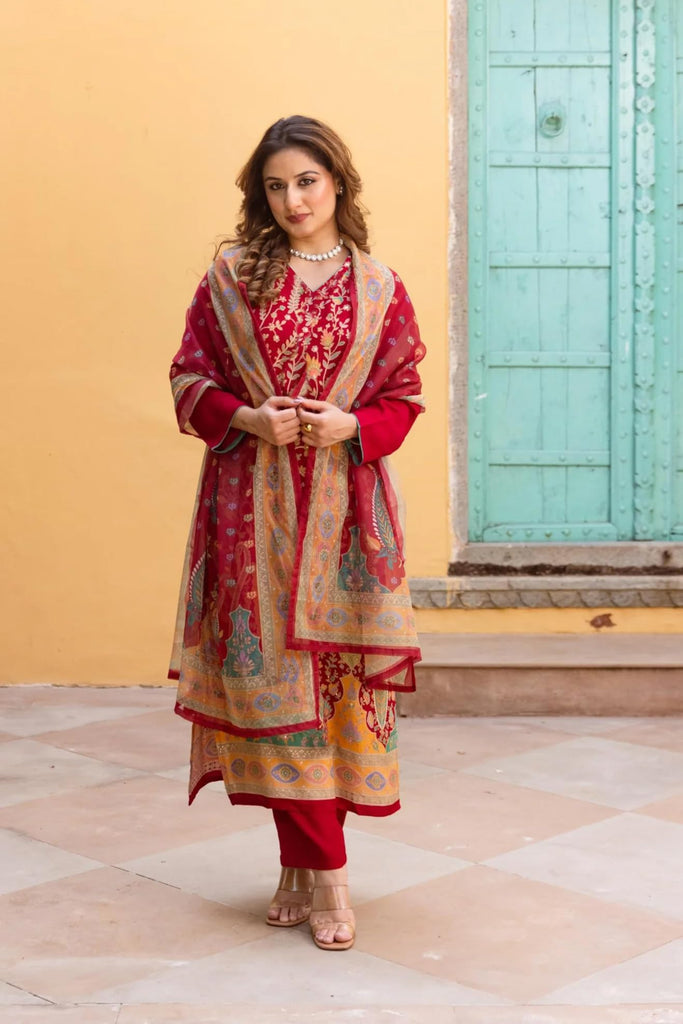 Anni Designer Women'S Rayon Viscose Straight Printed Kurta With Pant & Dupatta (Setul Red_S_Red_Small)