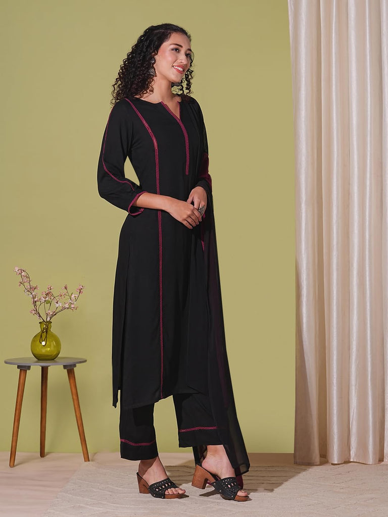 Anni Designer Women'S Rayon Viscose Straight Solid Kurta With Pant & Dupatta (Nanad Black-Vks01_L_Black_Large)