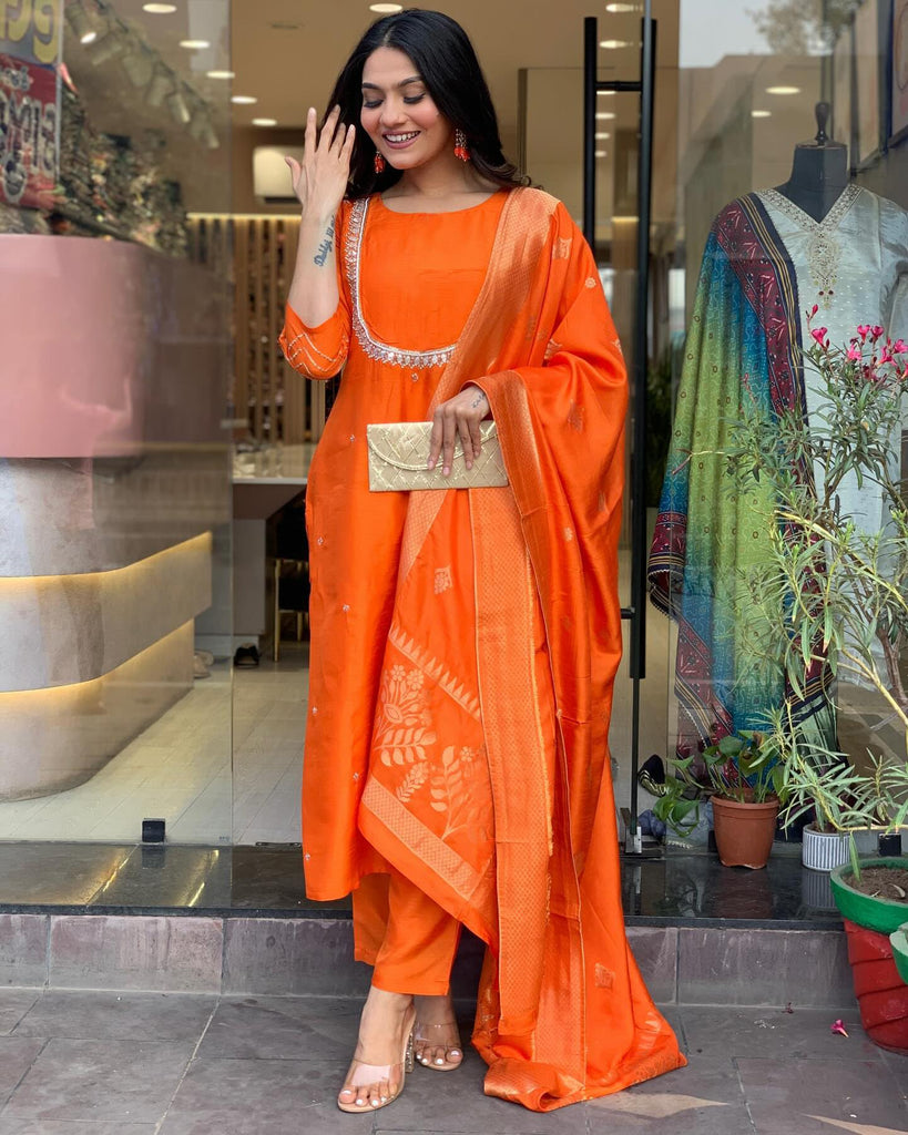 Anni Designer Women'S Silk Blend Straight Embroidered Kurta With Pant & Dupatta (Deluxe Orange-Vks01_L_Orange_Large)
