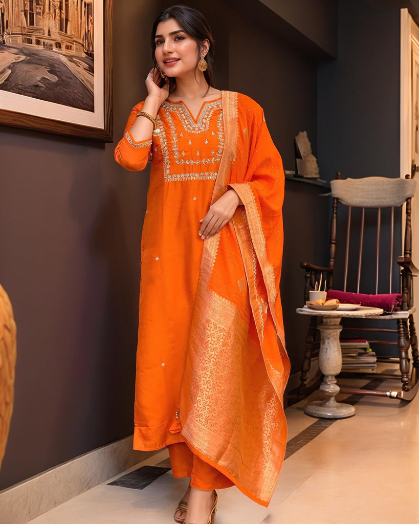 Anni Designer Women'S Silk Blend Straight Embroidered Kurta With Pant & Dupatta (Manushi Orange-Vks05_5Xl_Orange_Xxxxx-Large)