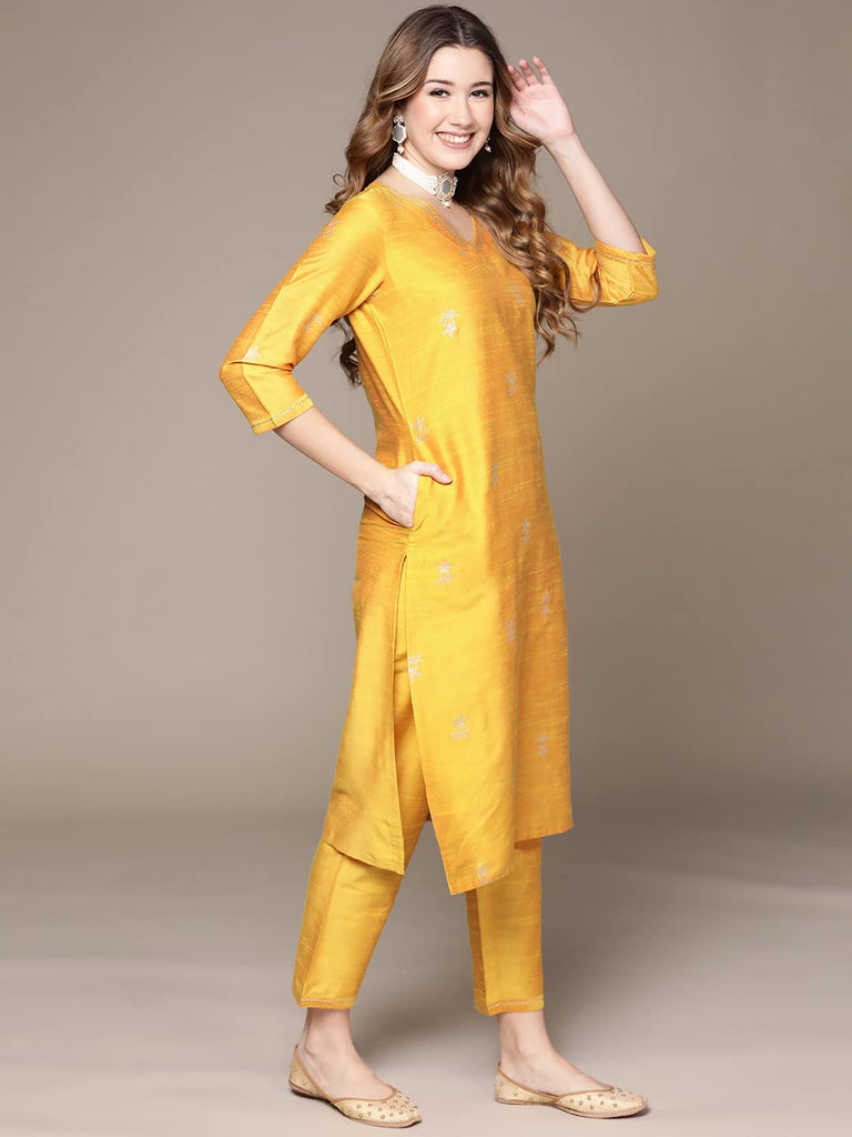 Anubhutee Women'S Cotton Yellow Ethnic Motifs Printed Straight Kurta Suit Set With Pants Yellow M