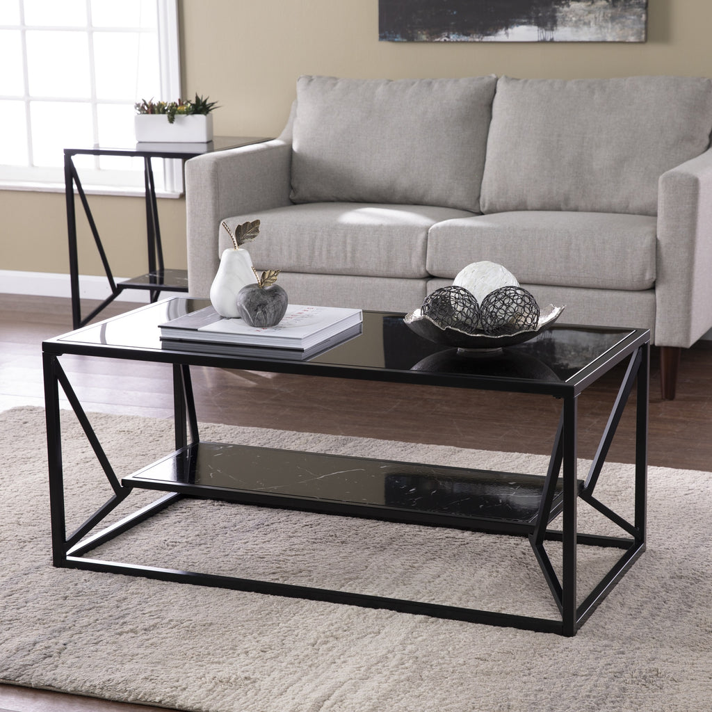 Create A Sleek, Modern Feel In Your Living Space With This Glass-Top Coffee Table. A Black Glass Tabletop Provides Plenty Of Room For Storing Magazines Or Serving Up Snacks, While The Faux Marble Shelf Displays Dcor Pieces. The Unique Frame Design Crafts A Chic, Geometric Feel, Highlighted By The Neutral, All-Black Color Scheme. Add Extra Storage Without Sacrificing Your Style When You Bring Home This Glass And Faux Marble Cocktail Table.