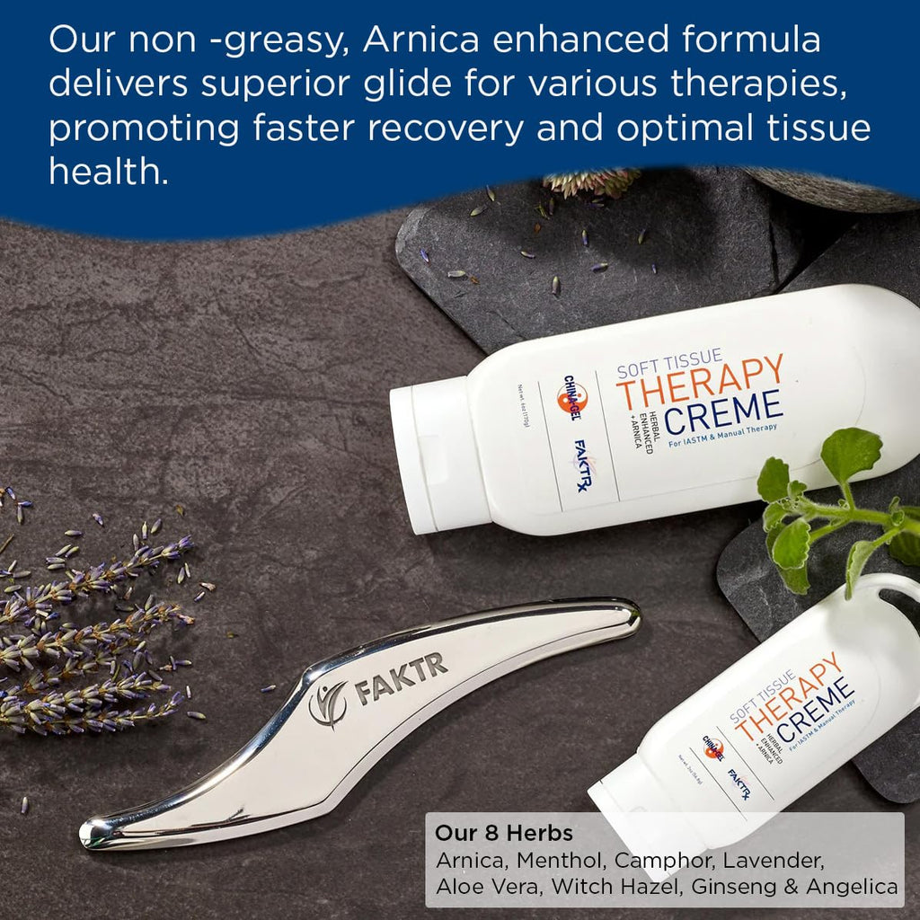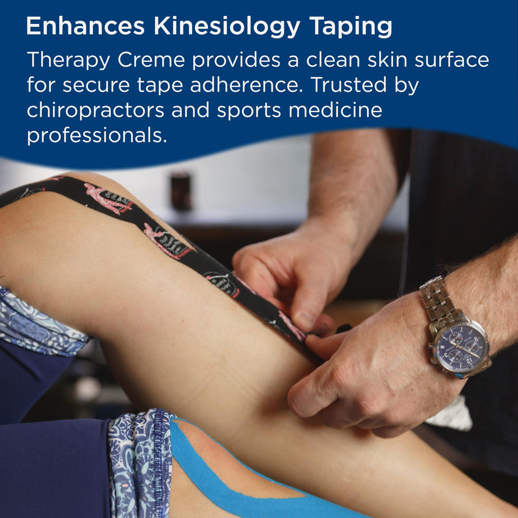 Therapy Creme contains the same herbal ingredients as China-Gel with the addition of Arnica and generates a gentle and comfortable cooling sensation and subtle herbal scent. Unlike most traditional emollients, this creme leaves the skin clean and slightly tacky after treatment - allowing you to tape directly over the area without having to wipe or clean it allowing practitioners to treat and move on without cleanup or staining.
