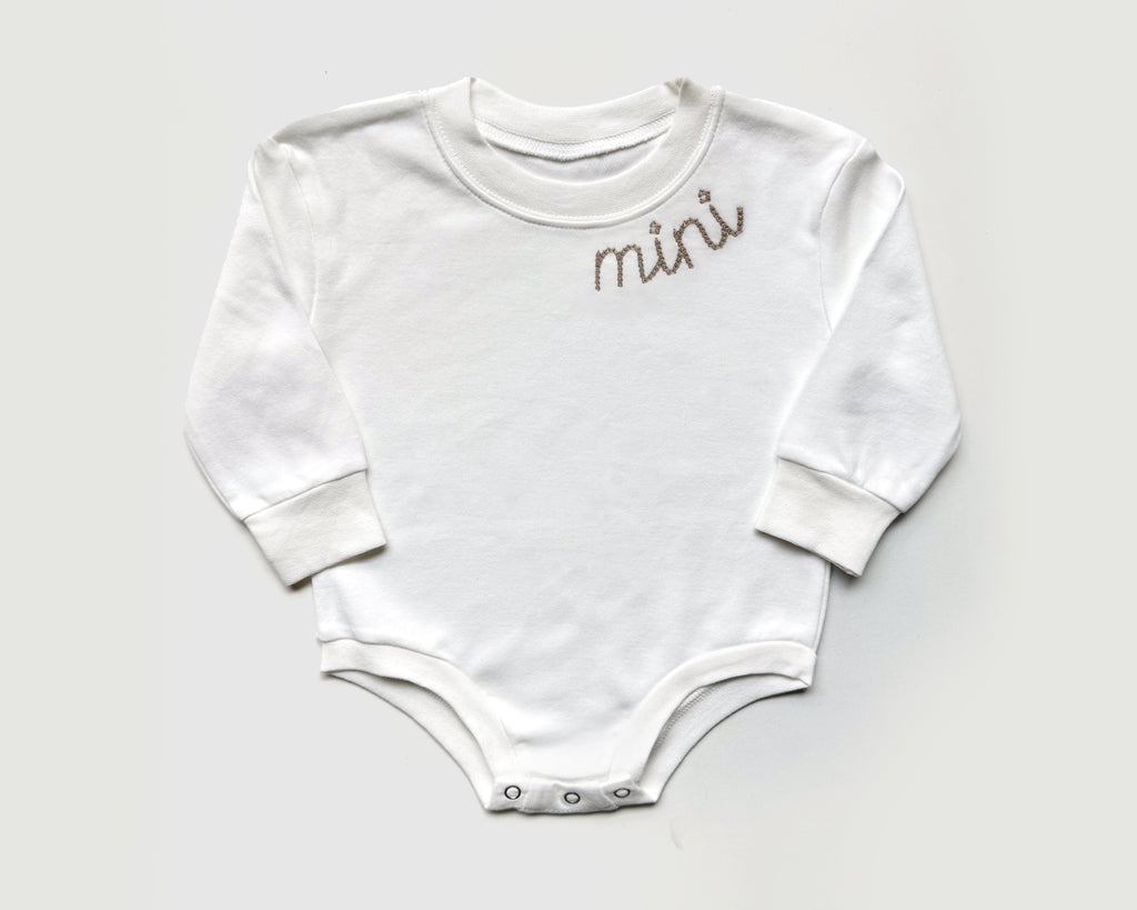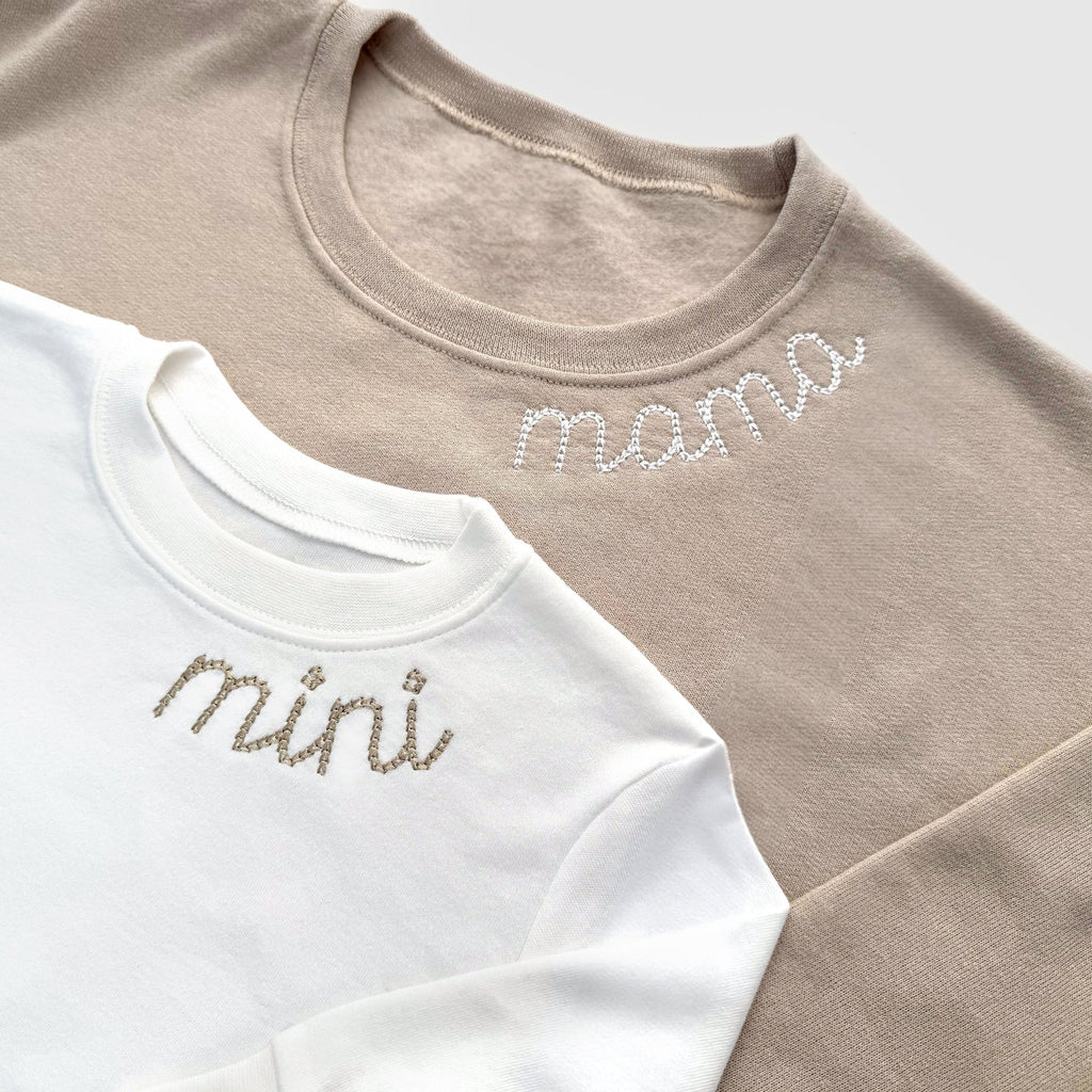 This charming create your own baby and mommy set includes a beige/sand sweatshirt for mom, beautifully embroidered with “mama” in white thread, and a matching baby onesie or toddler sweatshirt in soft white with sand embroidery that says “mini” or "mama's boy".