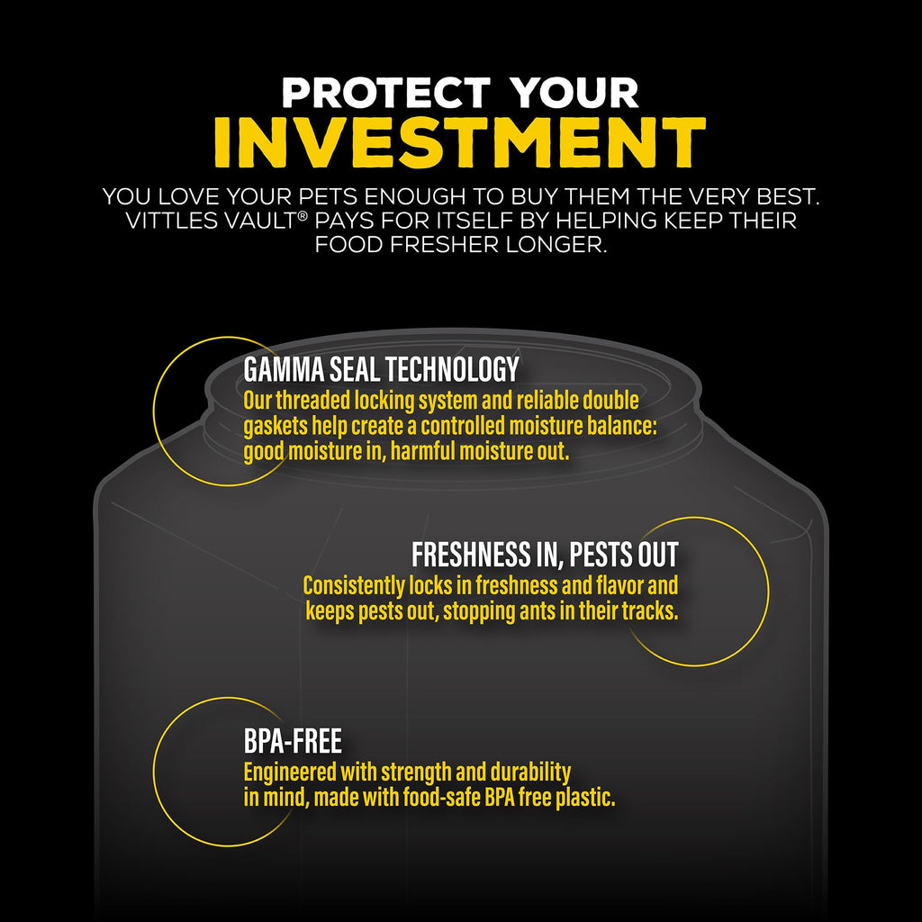 Keep your pets food tasty like a new bag with the Vittles Vault airtight storage container. Available in small and large sizes, Gamma2 Vittles Vault containers for pets are perfect for storing dog treats, cat food, birdseed, and more dry food. The stackable Vittles Vault is ideal for saving space in your home. Choose the right size based on kibble shape and density; when in doubt, opt for the next size up. Engineered from durable, BPA-free plastic, our container won't shatter or crack, even if dropped. Regular washing and drying prevent oil absorption and keep food from going rancid.