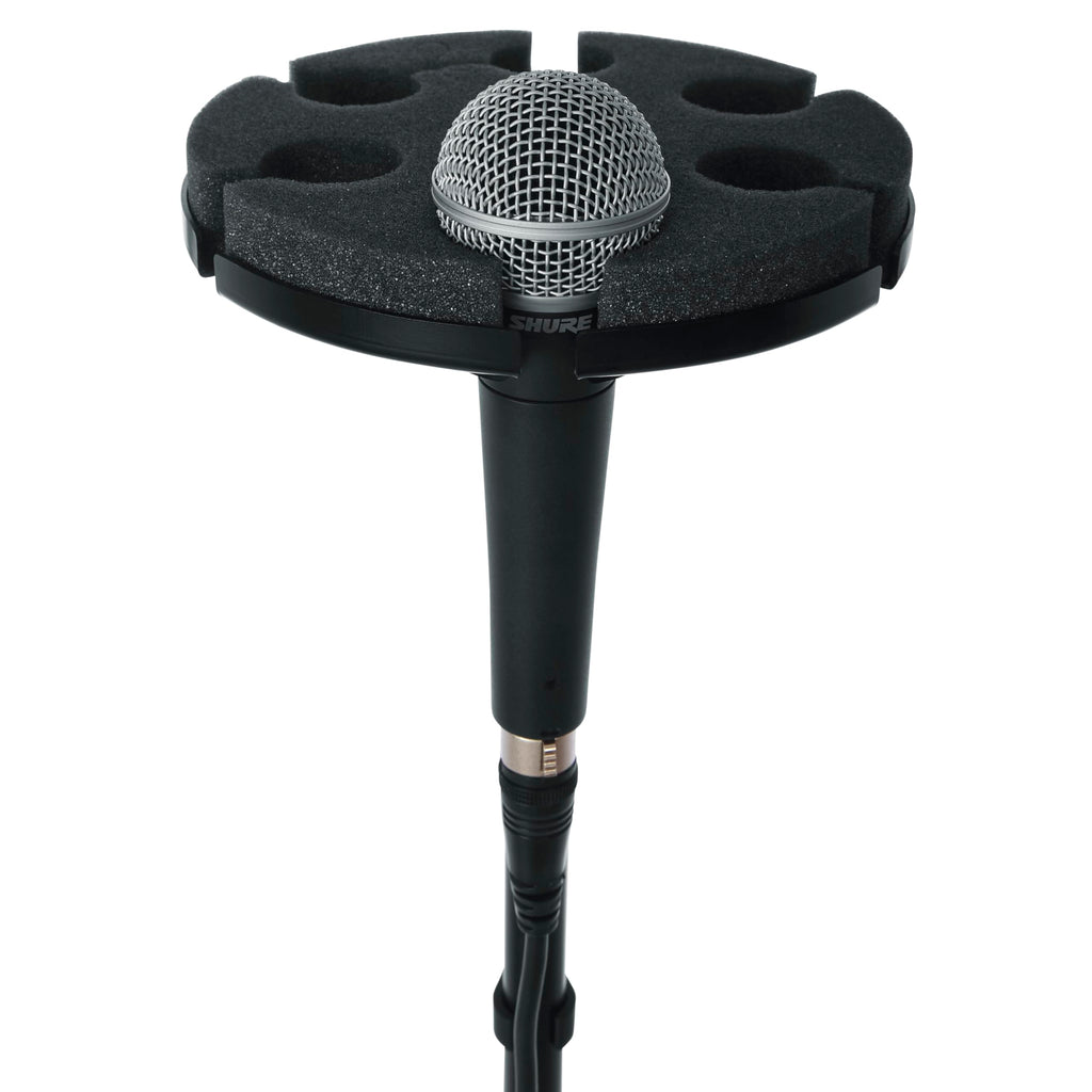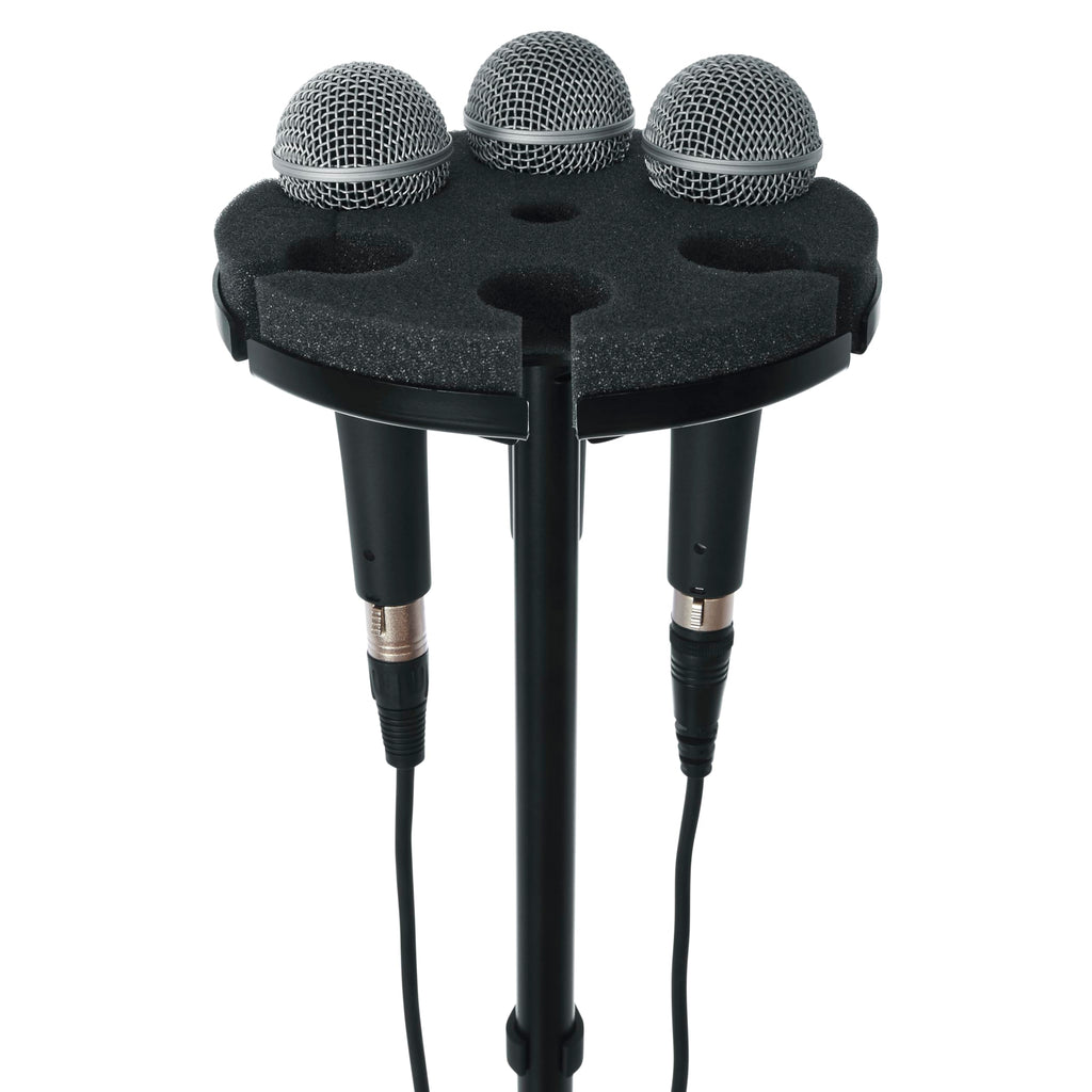 Gator Frameworks GFW-MIC-6TRAY six capacity microphone tray quickly and easily attaches to most standard microphone stands. The steel base firmly holds the microphones in place while the foam padded cradle cushions the microphones and minimizes noise when placing or removing microphones in the tray. The circular design of the GFW-MIC-6TRAY fits six microphones into a small space Perfect for small clubs to concert venues. When you need to have access to multiple microphones but need to keep them organized, protected and close at hand, The GFW-MIC-6TRAY from Gator Frameworks is ready to assist.