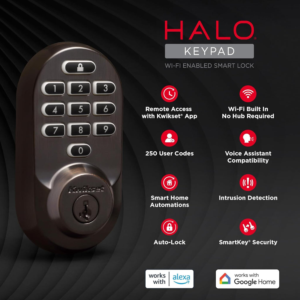 Wi-Fi enabled smart door lock gives you keyless entry and full control from anywhere with the Kwikset app—no hub required. Lock or unlock remotely, share up to 250 unique access codes with family or guests, and receive instant intrusion alerts for added security. Enjoy hands-free convenience with geofencing, auto-lock, and voice control through Amazon Alexa or Google Home. Easy to install with just a screwdriver, it fits standard doors and comes backed by a lifetime mechanical/finish warranty and 1-year electronics warranty.