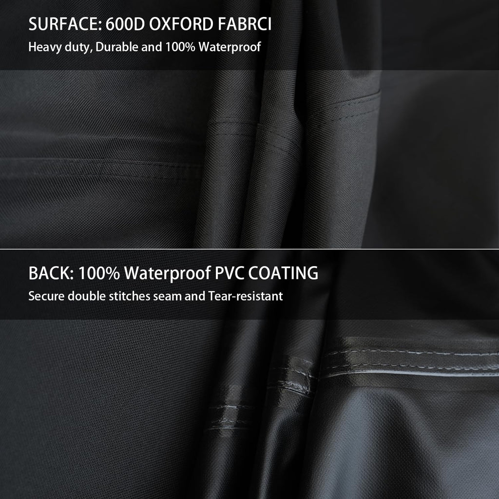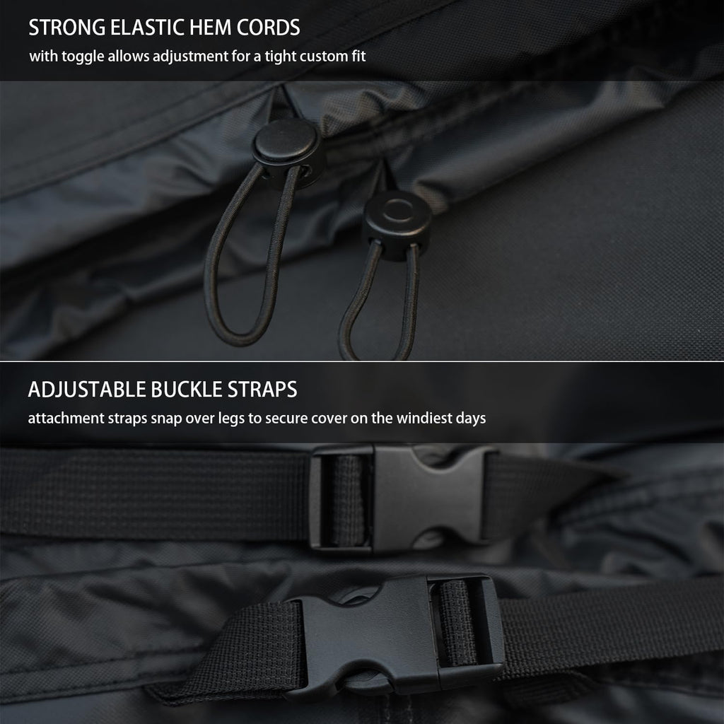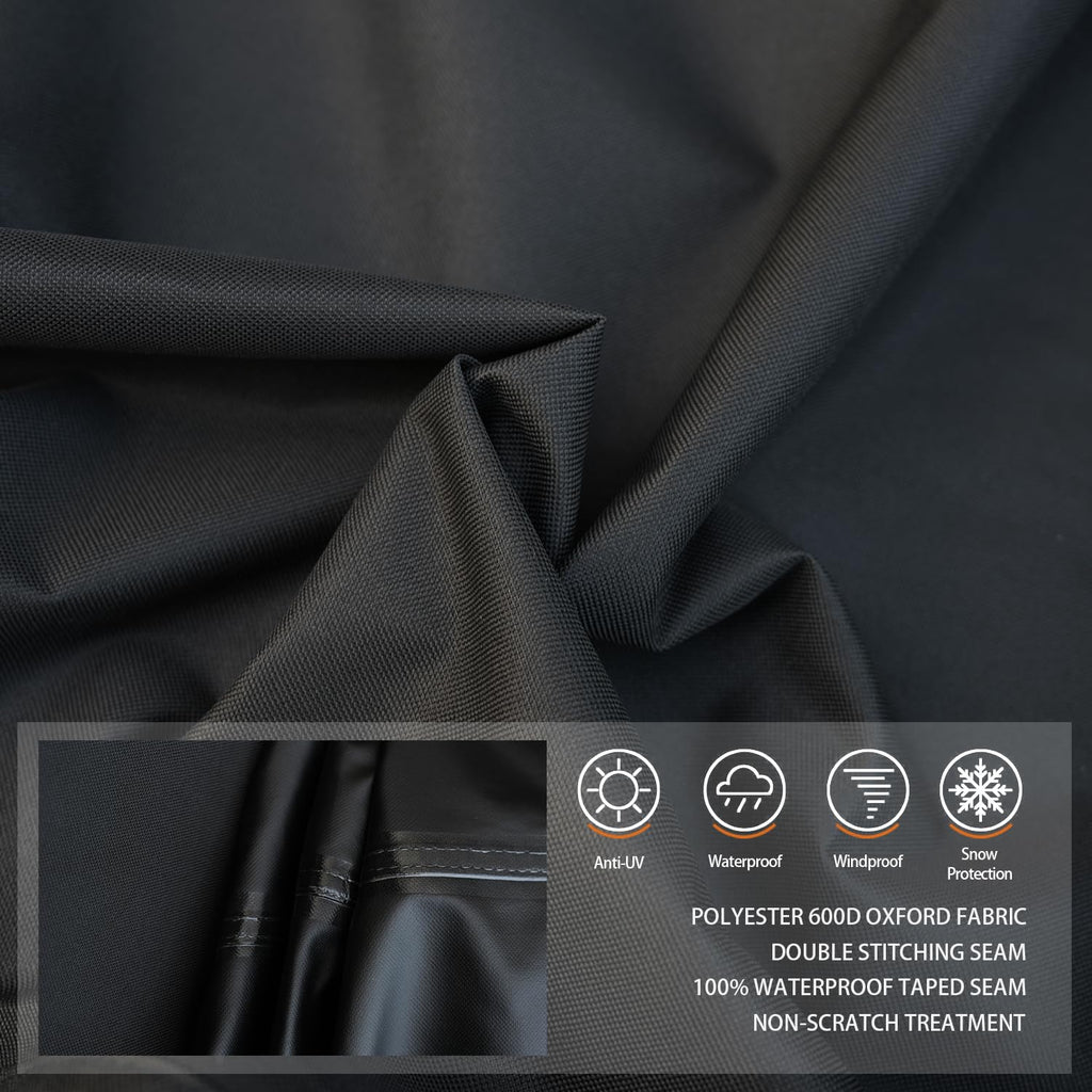 Outdoor Patio Furniture Set Cover Table and Chair Cover Water Resistant and Heavy Duty, 111 inchesSpecifications: Color: Black Size: 111 long x 74 wide x 28 highFabric: Durable oxford polyester with water-resistant laminated backing All-Season Protection: Yes UV Resistant: Yes Water Resistant: Yes Adjustable Hem: Elastic hem cord with adjustable toggle.WHY CHOOSE CKCLUU CKCLUU's mission is to protect our planet home by reducing the world's waste. Founded in 2016 by a group of environmentalist product designers, they are looking for ways of reducing the non-green impact on the earth.One of the most effective solutions was to protect what we already have with covers. So we set out to develop more high quality covers for you. LOVE THE EARTH, LOVE YOUR ASSETS, COVER WITH CKCLUU