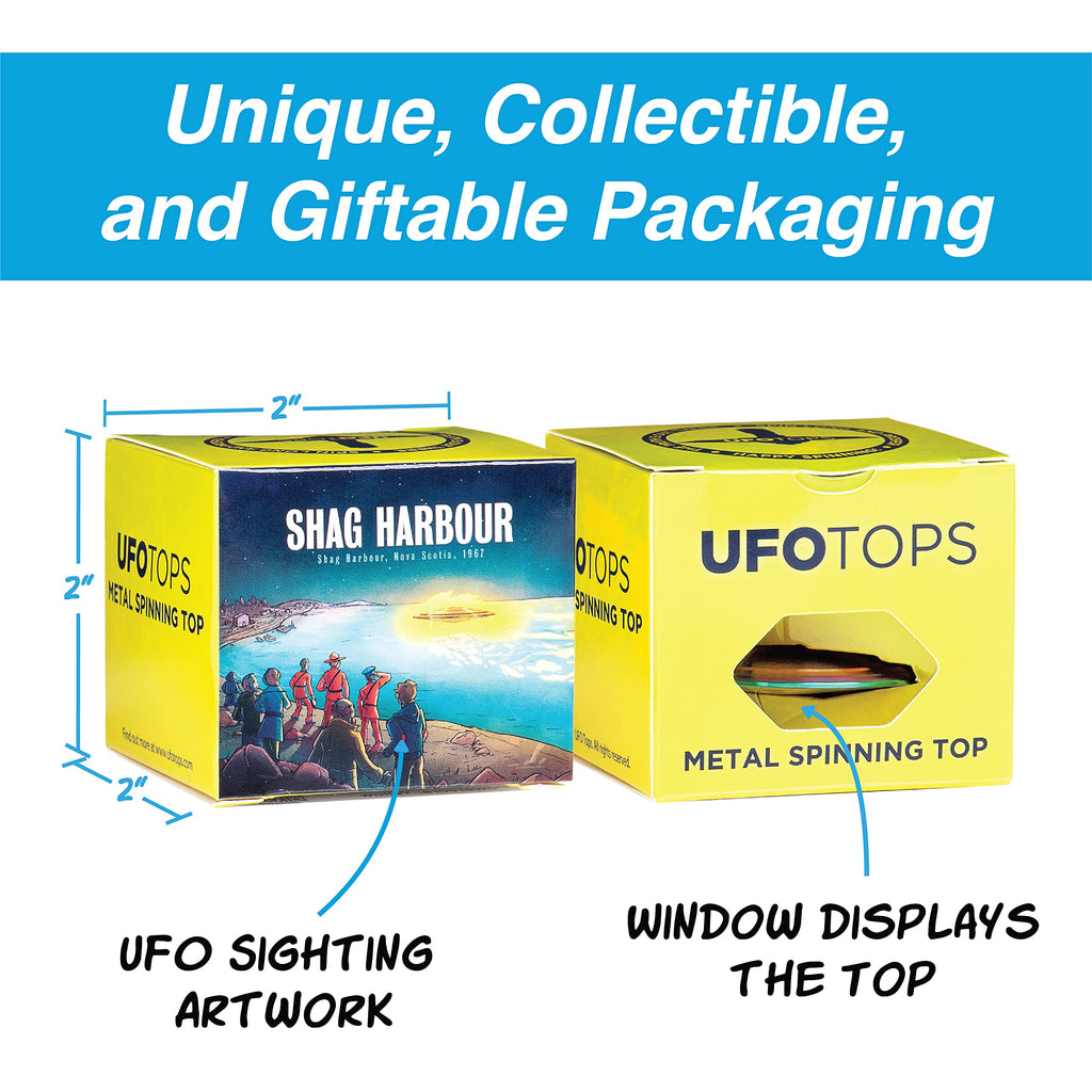 The Shag Harbour UFO Top is a metal spinning top inspired by the 1967 Shag Harbour, Nova Scotia UFO sighting event. Shag Harbour consists of an electroplated stainless steel UFO body and Solar Yellow aluminum Power Core. Shag Harbour is one of three in the Triangulum Series and launched on Kickstarter in the summer of 2021.