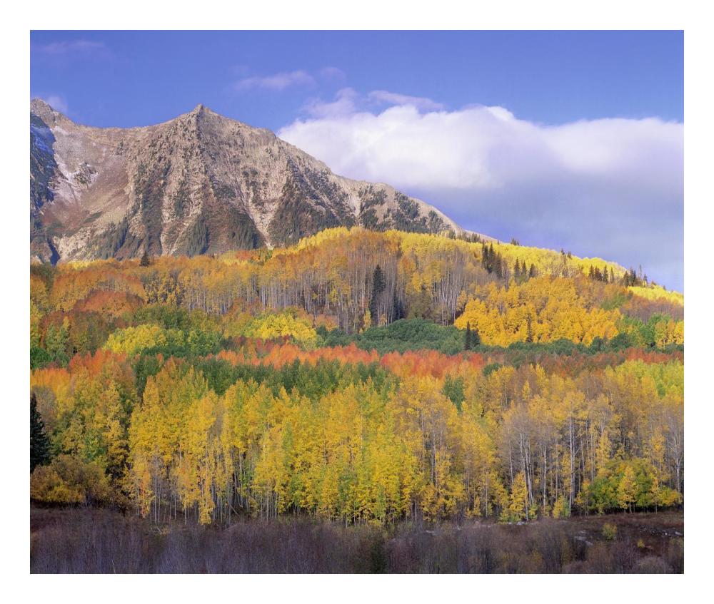 It is a photographic art piece. The image captures the beauty of a quaking aspen forest during autumn.