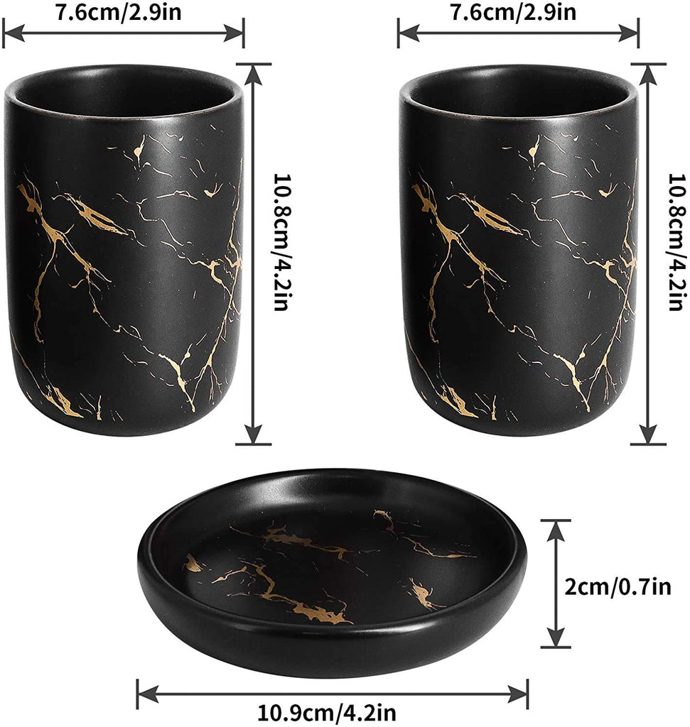 4 Pieces Bathroom Accessories Set -A suite suitable for the master bathroom accessories set, but also as guestroom bathroom accessories set,beautiful gold-black ceramics bathroom accessories four sets,made of solid ceramics,very beautiful and durable. Ideal Decoration Fits Various Styles - Ideal for home decor, rustic decor, bathroom decor, farmhouse decor, industrial style, western decor, morden style, contemporary decor, country bathroom decor. Prefect Gift Choice -This bathroom accessories set must be a great gift for anyone. You can give it to your wife, daughter, girlfriend, good friend, birthday present, Mother's Day present, New Year gift. Specifications: Material: Ceramics Dispenser Soap Pump: 12oz, 6.8x2.8 Tumblers: 12oz, 4.56x2.87 Soap Dish: 5.1x0.98 Suitable for: bathrooms, hotels, hotels, restrooms. Parcel include: Soap Dispenser x 1 Tumbler x 2 Soap Dish Tray x 1