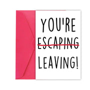 Goodbye Card:At any meaningful time, you can give this card to someone close to you | Retirement Greeting Card:A farewell card has wonderful quoteYou Are Not Leaving but Escaping,You can send this gifts for you lover | Products Information:This greeting card size is 8 x 5.3 inches / 20.5 x 13.5 cm,Printed on 300 grams of recyclable white paper,and it comes with a red envelope and envelope sticker | Blank Inside:The interior of the product is blank, with only a pattern printed on the front. If you need it, you can fill in the necessary text internally to express your deep thoughts | About Us:Welcome to our store for purchase. We have a variety of greeting cards available, and you can freely choose what you like